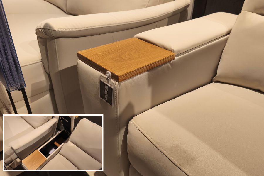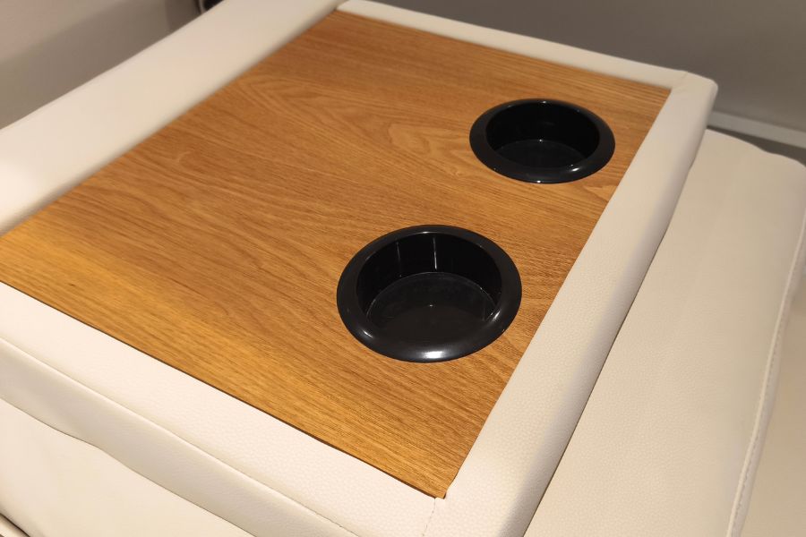 中央収納ユニットを追加すると、座面が区切られるような形となり、ひじ掛け兼テーブルとして使えます。ただテーブルといっても幅が20㎝ほどのスペースしかなく、木天板部分も僅か20㎝×20cmほどのスペース。飲み物を置くには少し不安定に思えます。