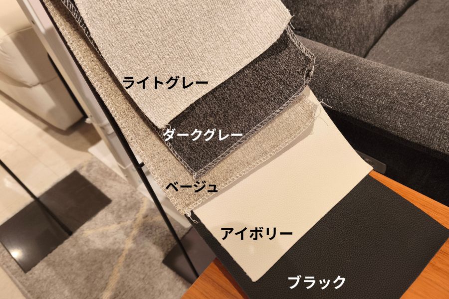 カラーバリエーションは布生地がダークグレー、ライトグレー、ベージュの3色。合皮生地はアイボリー、ブラックの2色です。