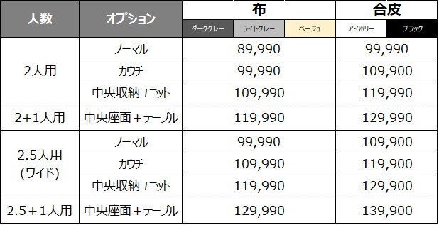 サイズを2.5人用にすると+1万円。合皮生地にすると+1万円。カウチにしても+1万円。
