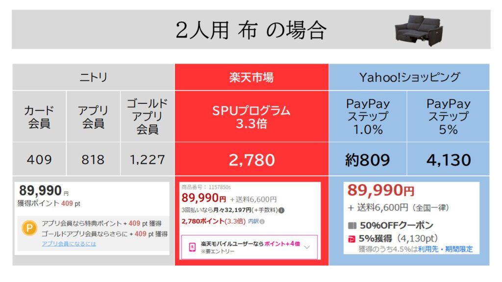 つまり、ニトリ店舗などで購入したときと全くおなじサービスが受けられるのに、楽天市場かヤフーショッピングで購入したほうが、使い勝手の良いポイントを大量にゲットできるというわけです。